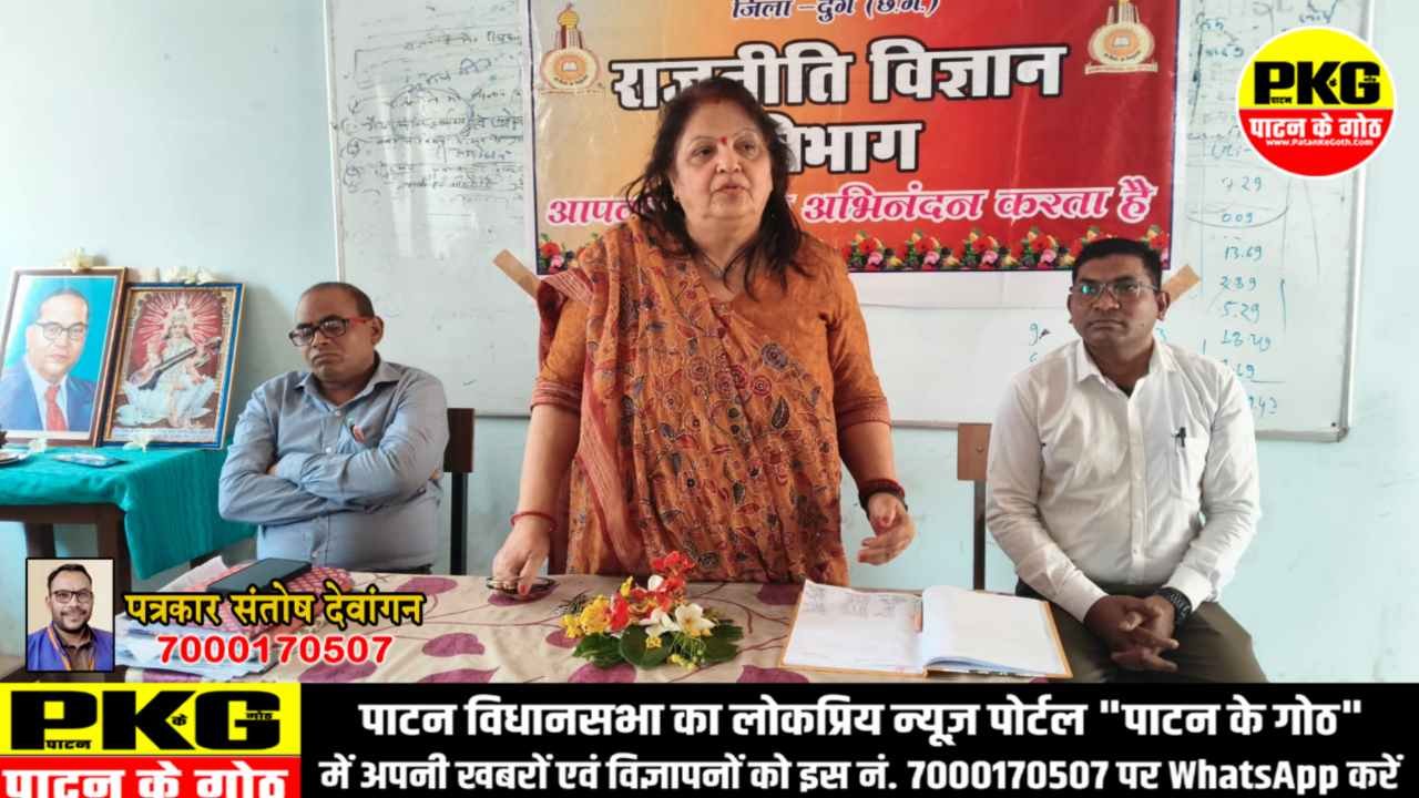 पाटन : शासकीय चंदूलाल चंद्राकर स्नातकोत्तर महाविद्यालय पाटन में प्राचार्य डॉ नंदा गुरवारा के मार्गदर्शन में राजनीति विज्ञान और राष्ट्रीय सेवा योजना के सयुंक्त तत्वाधान भारत रत्न बाबा साहेब डॉ भीमराव अम्बेडकर की 135 वीं जयंती मनाया गया। माँ सरस्वती व बाबा साहब की छायाचित्र पर माल्यार्पण करके कार्यक्रम का शुरुआत किया गया।