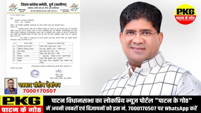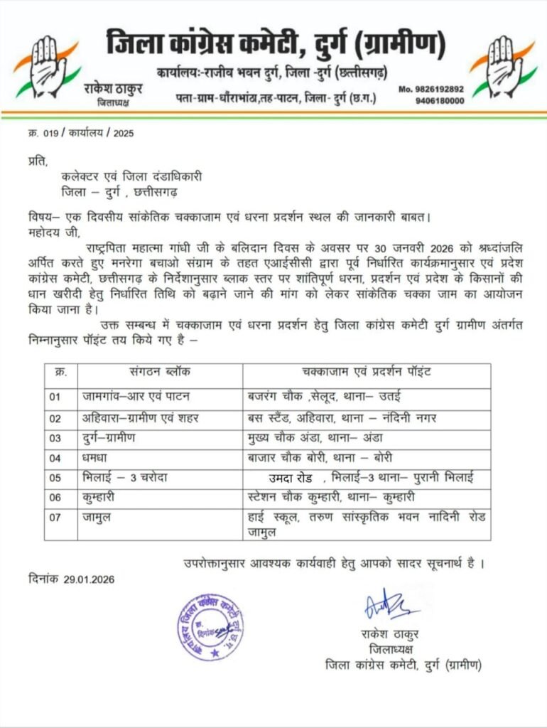 दुर्ग : राष्ट्रपिता महात्मा गांधी जी के बलिदान दिवस के अवसर पर 30 जनवरी 2026 को जिला कांग्रेस कमेटी दुर्ग (ग्रामीण) जिलाध्यक्ष राकेश ठाकुर के नेतृत्व में एकदिवसीय सांकेतिक चक्काजाम एवं धरना-प्रदर्शन का आयोजन दुर्ग जिले के 7 स्थान पर किया जाएगा जिसके लिए अलग अलग पॉइंट बनाया गया है। यह कार्यक्रम अखिल भारतीय कांग्रेस कमेटी (एआईसीसी) के निर्देशानुसार तथा प्रदेश कांग्रेस कमेटी, छत्तीसगढ़ के मार्गदर्शन में शांतिपूर्ण रूप से संपन्न किया जाएगा।