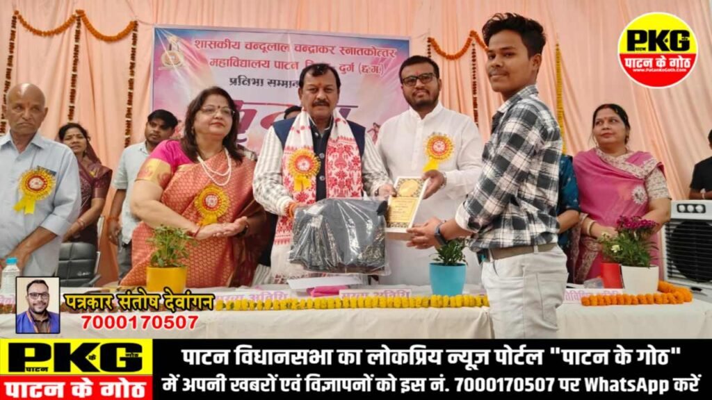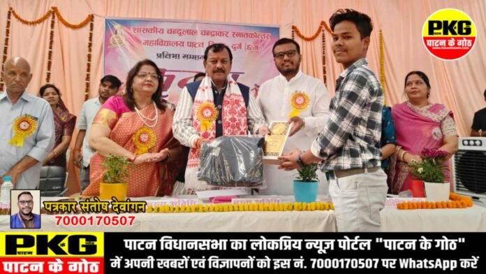 पाटन। शासकीय चंदूलाल चंद्राकार स्नातकोत्तर महाविद्यालय पाटन में प्राचार्य डॉ नंदा गुरवारा के मार्गदर्शन में नव ऊर्जा एवं प्रतिभाओं के प्रोत्साहन हेतु प्रतिभा सम्मान समारोह मृदंग 2026 का आयोजन किया गया है। कार्यक्रम के मुख्य अतिथि माननीय विजय बघेल जी सांसद दुर्ग लोकसभा, माननीय भूपेश बघेल जी पूर्व मुख्यमंत्री छग शासन एवं विधायक पाटन विधानसभा, कार्यक्रम के अध्यक्ष डॉ. नंदा गुरवारा प्राचार्य शासकीय चंदूलाल चंद्राकर कला एवं विज्ञान महाविद्यालय पाटन, अति विशिष्ट अतिथि जितेंद्र वर्मा प्रदेश मंत्री भाजपा, दिलीप साहू जिला महामंत्री भाजपा दुर्ग, योगेश निक्की भाले जी अध्यक्ष नगर पंचायत पाटन एवं जन भागीदारी प्रबंधन समिति पाटन कालेज, विशेष अतिथि रानी केशव बंछोर भाजपा मंडल अध्यक्ष पाटन, डॉ श्रीमती अनुपमा आस्थाना क्षेत्रीय अपर संचालक दुर्ग संभाग रहे।